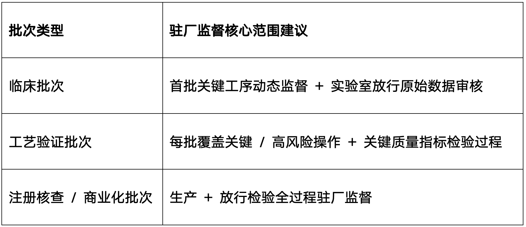 我们的专家建议:对于委托生产生物制品、中药注射剂、多组分生化药等高复杂性或高风险产品,建议从工艺验证批开始即实施生产与检验全过程的驻厂监督。