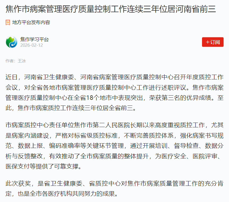 市病案质控中心责任单位焦作市第二人民医院长期以来高度重视质控工作,尤其是病案内涵建设,严格对标省级质控标准,不断完善质控体系,强化病案书写规范、数据上报、编码准确率等关键环节管理,通过开展培训、督导检查、数据分析与反馈整改,有效推动了全市病案质量的整体提升,为医疗安全、医院评审、医保支付等提供了可靠支撑。