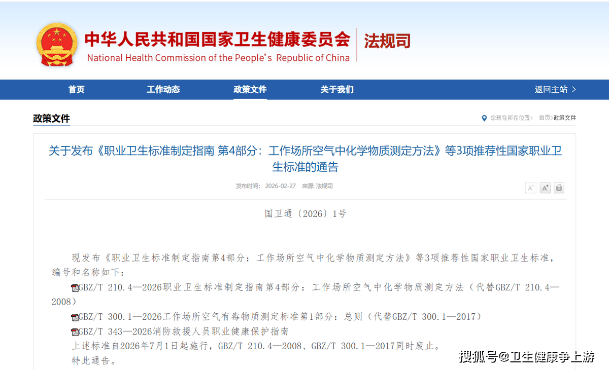 现发布《职业卫生标准制定指南第4部分:工作场所空气中化学物质测定方法》等3项推荐性国家职业卫生标准,编号和名称如下: